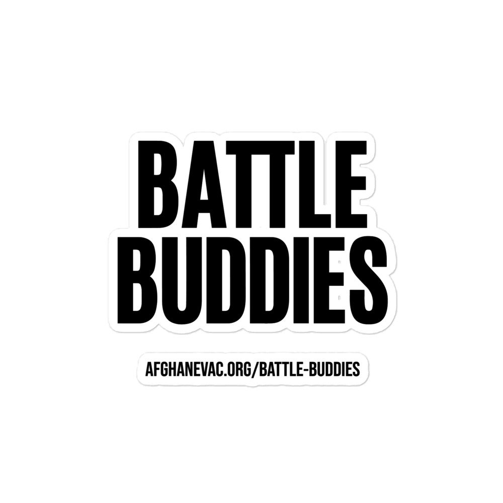 This 3x3" matte vinyl sticker features the bold Battle Buddies text logo and the AfghanEvac.org/Battle-Buddies URL—directing people to one of the most critical court solidarity efforts in the country.