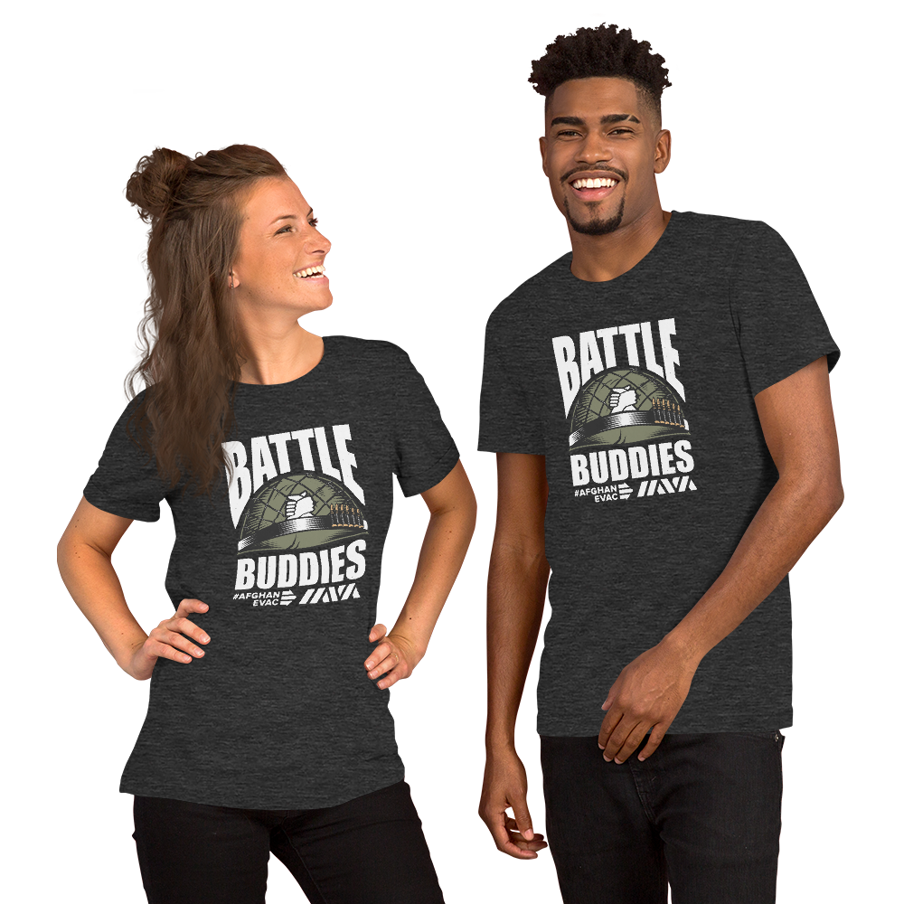 This limited-edition “Battle Buddies” T-shirt honors those showing up—veterans, civilians, and advocates alike—to support Afghan allies in immigration court. Whether you're standing next to someone facing unjust detention or speaking out against bad policy, this shirt makes it clear: you have their back.