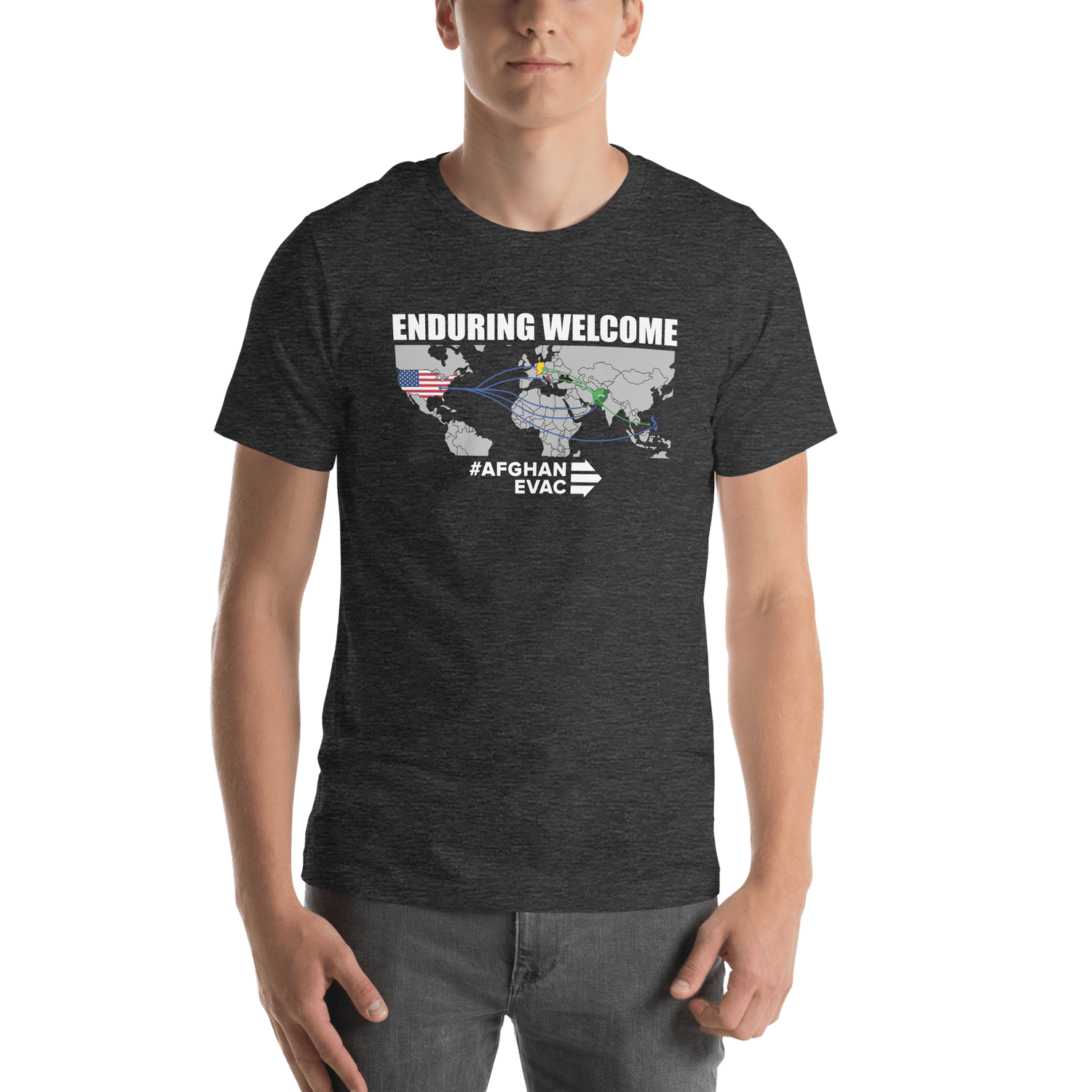 Featuring a striking global map graphic, this design illustrates the safe and legal movement of tens of thousands of Afghan allies to the United States. From conflict zones to communities of refuge, every line on this shirt represents a life redirected by collaboration, resilience, and moral clarity.