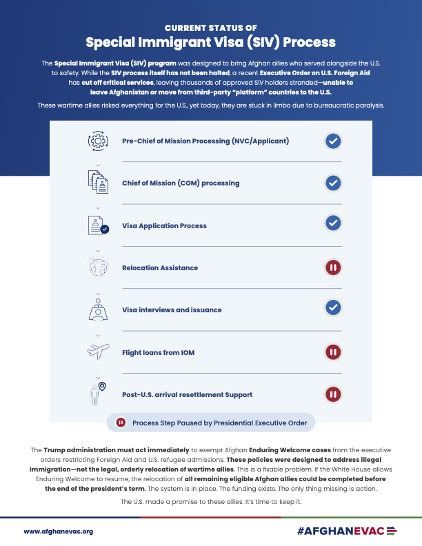 President Trump’s Executive Orders on foreign aid and the U.S. Refugee Admissions Program (USRAP) stopped our nation’s most secure and effective immigration pathway, Enduring Welcome. These actions have had severe national security consequences, stranding thousands of vetted Afghan allies, both refugees and SIVs, and putting American credibility and strategic interests at risk.