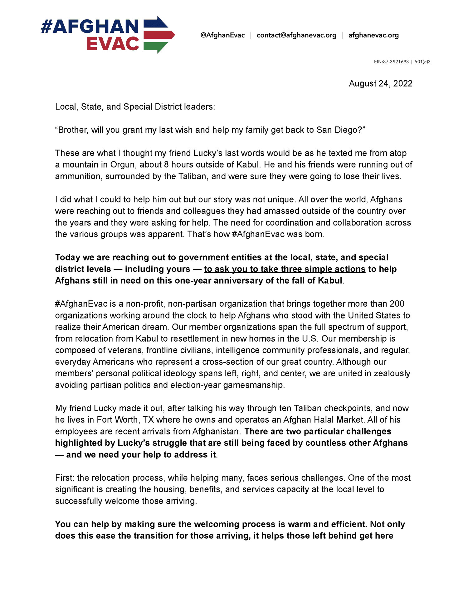 Today we are reaching out to government entities at the local, state, and special district levels — including yours — to ask you to take three simple actions to help Afghans still in need on this one-year anniversary of the fall of Kabul.