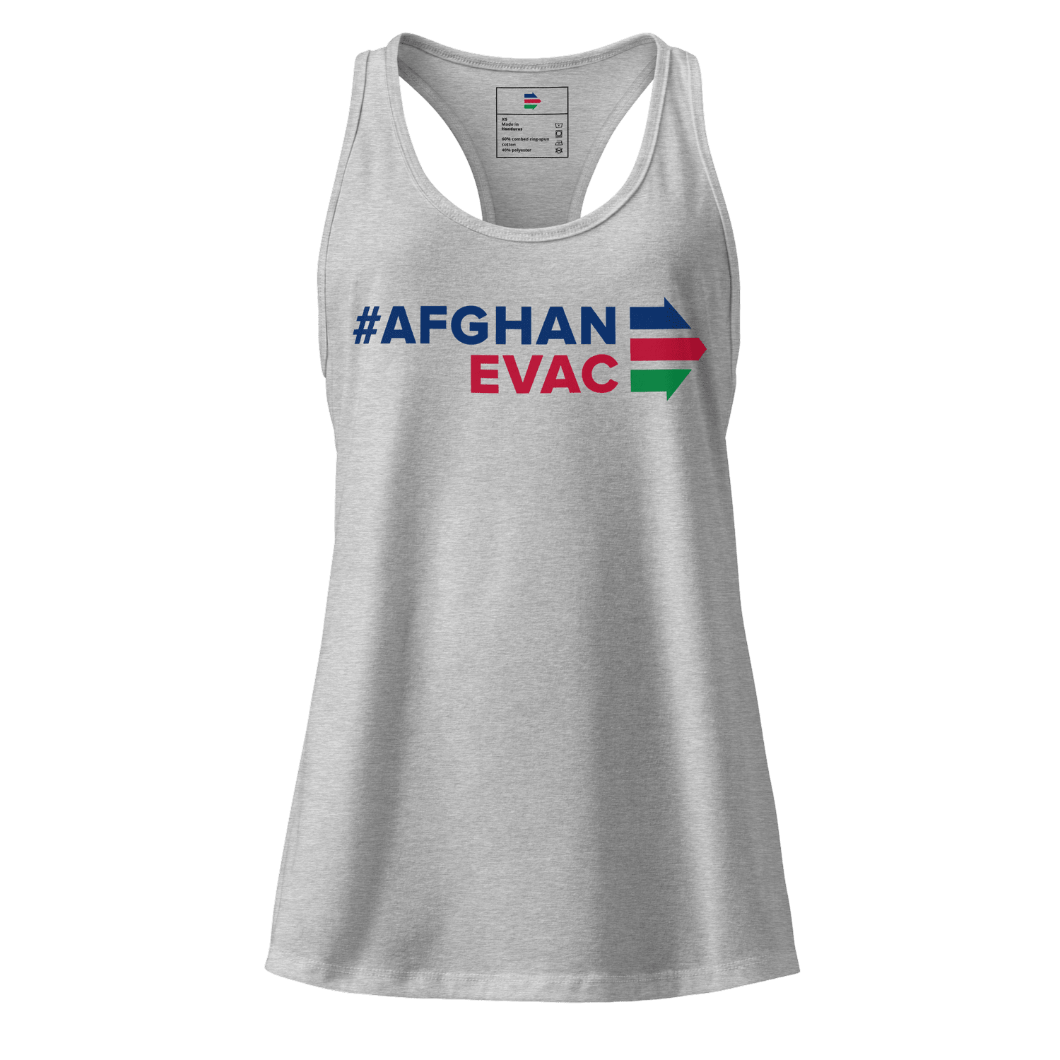Built for movement and made with purpose, this fitted racerback tank is lightweight, breathable, and form-flattering. Whether you're at the gym, at a rally, or out in your community, it’s a versatile piece that reflects your values—standing with Afghan allies and families still waiting for safety and reunification.
